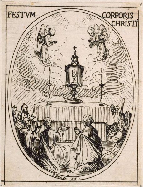 Curator: Jacques Callot, who lived from 1592 to 1635, created this small etching, "Nativity". It’s currently held in the Harvard Art Museums. Editor: It feels so intimate, almost like a whispered secret. The lines are incredibly delicate. Curator: Callot was a master of etching, a printmaking technique using acid to cut into a metal plate. Consider the implications of reproducible religious iconography. Editor: Absolutely. And notice how he uses light – the divine light streaming down, contrasted with the humble setting. It speaks volumes about the sacred within the mundane. Curator: Think, too, about the economies of scale, how these images would have circulated, the labor required, the markets it supplied. Editor: For me, the oval frame and the ascending angels draw the eye upwards, creating a sense of hope and spiritual yearning. A testament to enduring faith, no? Curator: It is truly remarkable how such humble materials could produce these lasting works. Editor: An image pregnant with meaning, regardless of scale.
