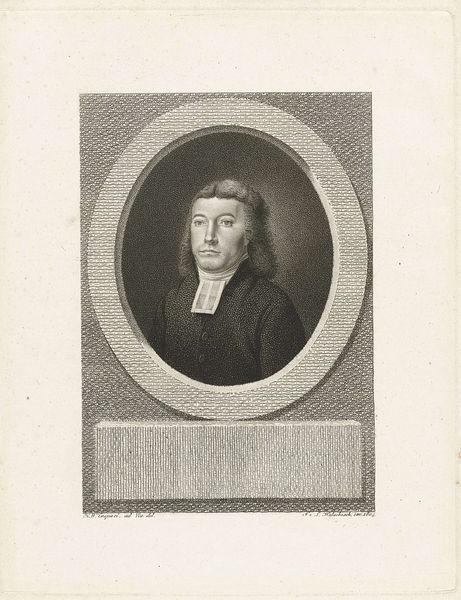 Curator: What strikes me first about this engraving is the sense of reserved dignity. Editor: Yes, there is an undeniable stillness, almost severity, in the portrayal. Shall we provide our listeners with some context? This is Jacob Houbraken's "Portret van Louise de Coligny," made between 1749 and 1759. Curator: Houbraken's use of engraving gives it a remarkable clarity. Every line contributes to the overall impression. The oval frame containing the subject is interesting to me, reinforcing her elevated social position through classic forms. Editor: Indeed. And look closely at the details laden throughout—the pearls, the lace, the subtle play of light and shadow on her face. These symbols speak volumes about her status and perhaps even character, considering pearls represent purity, as just one reading. Curator: You're right to point that out, I believe the setting tells another crucial narrative; these images served a function in solidifying lineage, prestige and also played a pivotal role in the marriage market. This piece and portraits like it would reinforce familial power across generations. Editor: It is more than just capturing a likeness, wouldn't you agree? Her steady gaze feels very intentional, an assertion of her presence, projecting wisdom, experience. Curator: Yes, I would agree. Although seemingly austere at first glance, looking closely it conveys a life marked by significant events. It underscores the very public role that women, especially women of stature like Coligny, occupied within Dutch society at this time. Editor: Reflecting on this work together, I find myself drawn to the tension between the formal representation and the subtle hints of personal character that still shine through, something not easily found. Curator: Yes, seeing beyond the public image to discern an individual is where art becomes truly powerful. This work reveals the power structures that surrounded Coligny, and perhaps something about Coligny herself, a palimpsest of societal expectation.