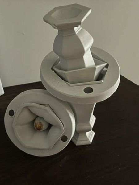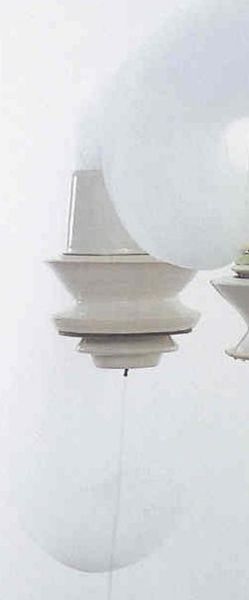 Untitled is one of a series of six untitled, hollow ceramic vessels collectively known as Beachy Head (Tate T12457–T12462). These works are designed to be suspended from the ceiling with stainless steel wire and filled with soap detergent. The ceramic vessel that constitutes the body of Untitled has a glassy off-white surface coating and is shaped like a spinning-top. From the centre of its base runs a transparent silicon hose that is connected to an air compressor that feeds oxygen into the vessel. When the air compressor is switched on, the oxygen mixes with the soap detergent to produce frothy white foam that exudes out of the vessel’s spout. This column of foam, which maintains the cylindrical form of the inside of the vessel, grows steadily upwards until it can no longer support itself. The foam bends and flops flaccidly around the vessel before oozing on to the floor below, leaving a sticky entropic residue. The device continues to produce the foamy precipitate until the emission is entirely dispersed.