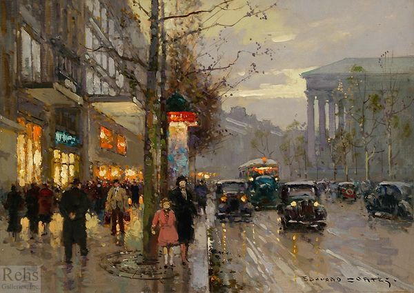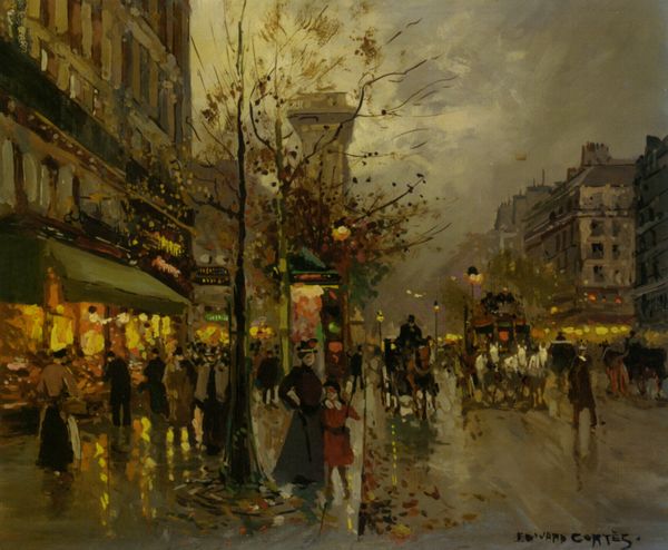 Curator: Edouard Cortes gifts us a view of the "Champs-Élysées," rendered in oil paint with an impressionistic verve, bringing forward layered questions of representation and spectatorship within the Parisian landscape. Editor: Oh, wow. I mean, the first thing that hits you is how alive it feels. The wet street reflecting all those lights…it’s almost humming with energy, right? It feels like a stage set, just waiting for something dramatic to happen. Curator: Absolutely. Consider the period—likely early 20th century. Cortes masterfully captures not just the physical space, but also the socio-economic fabric. The blurred figures, the emergent automobile culture, the architecture, each aspect points to the modernization underway. Whose Paris is this, and who is granted access? Editor: Hmmm. You know, I'm getting a bit of melancholia too. The muted sky, the way the light sort of pools on the ground. It feels a little lonely even amidst all the activity. Like being in a crowd but still feeling separate. Plus, all those flickering lights. Like old movie houses before everyone started staying home watching those "moving pictures." Curator: The romantic interpretation holds sway. The solitary figures echo similar themes we see explored across Europe: alienation, class dynamics. The way Cortes frames the Arc de Triomphe in the distance places it almost as a beacon, something those present might aspire to but remain separated from due to any combination of capitalistic ventures, ableism, patriarchal demands... Editor: It's interesting you say that. It's funny; it could be seen as a happy snapshot of city life. For me, it’s like longing for something that's slipping away, some essence of life or possibility lost. Kind of tragic when you stop to consider it. The figures, especially... Curator: Precisely, these sorts of works ask us to evaluate how we ourselves exist with the structures that exist within public. It also speaks to access -- can the family, likely immigrating given the historical placement and access to social standing and income level of the family... are they able to get to where they need to safely and unharmed in mind, body, soul, and future? Editor: What I like most is it takes what could be ordinary - a city street - and turns it into something haunting and deeply affecting. I will certainly consider this notion more as I'm sure a second and third looks reveals even more. Curator: Indeed. Through a lens attentive to questions of gender, race, and socio-economic circumstance, we can fully appreciate the intersectional layers imbedded within the 'everyday'. It asks us as active, participating community members to further consider what active measures of community wellness look like through an artistic, architectural, societal lens.