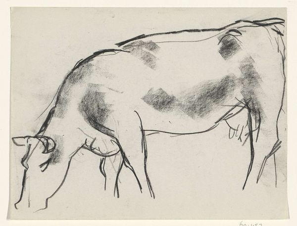Editor: We're looking at "Twee paarden en een veulen," or "Two Horses and a Foal," a pen and ink drawing by Leo Gestel, created between 1926 and 1928. I’m immediately struck by how economical the line work is; he captures so much with so little. What elements of the composition stand out to you? Curator: It’s a remarkable study in form and reduction. Notice how the overlapping lines create a sense of depth, yet the figures remain almost abstract. Consider how the varying line weights – heavier in some areas, lighter in others – define volume and suggest light. Where does the interplay of positive and negative space lead your eye? Editor: I keep circling back to the foal, perhaps because it’s more fully rendered. But then the two larger horses feel more imposing, especially given the starkness of the medium. It's a dance between simplicity and definition, would you say? Curator: Precisely. Observe how Gestel avoids shading, relying instead on the density and direction of the lines to model the forms. Semiotically, what is communicated by this restraint? Is there a particular emotional affect suggested? Editor: Maybe a kind of peacefulness? It’s interesting to think about how such a sparse rendering can feel so complete, not really lacking anything. It makes you think about what is truly essential in art. Curator: Indeed. Through a formalist lens, this work highlights how essential elements – line, form, space – converge to create a cohesive and suggestive whole. Editor: I hadn’t really considered how much could be communicated through the bare minimum of lines. Thank you. Curator: And thank you. It’s always enriching to re-examine fundamental principles.