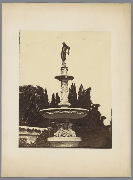 Curator: Before us stands a photograph, dating from around 1875 to 1900, depicting the Monument to Admiral Wilhelm von Tegetthoff in Vienna, presumably captured by A.F. Ozihak. The bronze statue, set atop an elaborate column, dominates the scene. Editor: My first impression is one of stark grandeur. The monument's sheer verticality, accentuated by the photograph's perspective, is quite imposing. The figures at the base lend a sense of dynamic tension, frozen mid-gallop it seems. Curator: Indeed. The photograph itself is a study in contrasts, with the strong vertical lines of the column juxtaposed against the more horizontally oriented base and the cityscape visible in the background. Note the subtle gradations of light and shadow; the monochromatic palette further emphasizes the monumentality of the sculpture. Editor: This monument says so much about Austria’s self-image after a major turning point. The placement of Tegetthoff so prominently suggests the crucial role of military victories to the crumbling Habsburg empire’s legitimacy. Curator: Absolutely. Consider how this image likely functioned within Viennese society at the time. Public monuments like this were integral in shaping national identity, reinforcing shared narratives through visual symbols and idealized representations of national heroes like Admiral Tegetthoff. The monument's elaborate design – the column with its nautical flourishes, the powerful sculptural groupings – communicates a deliberate message of power, imperial reach, and enduring legacy. Editor: I'm struck by the somewhat dated nature of this particular type of war hero glorification, already somewhat behind the times, even back then. Note how that classicizing style harkens back to antiquity, consciously seeking to align Tegetthoff’s naval successes with the storied legacies of Roman or Greek generals. But also, the new media form – photography itself – suggests a slow turning away from established art styles. Curator: From a formalist perspective, this photographic document enables an almost hyper-real experience. Its tonality heightens a dramatic and sublime emotional response and reading from its public. Editor: It’s hard to ignore the complex history embedded within this image, a time when imperial aspirations clashed with nascent nationalisms and modernizing technologies forever changing warfare and its representation. Thanks for those thoughtful formal insights! Curator: Likewise!