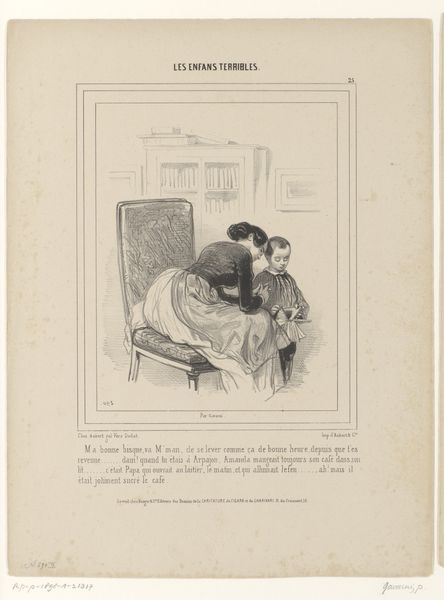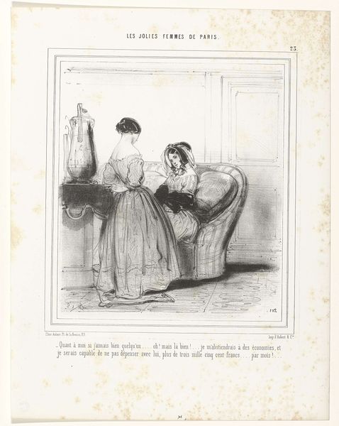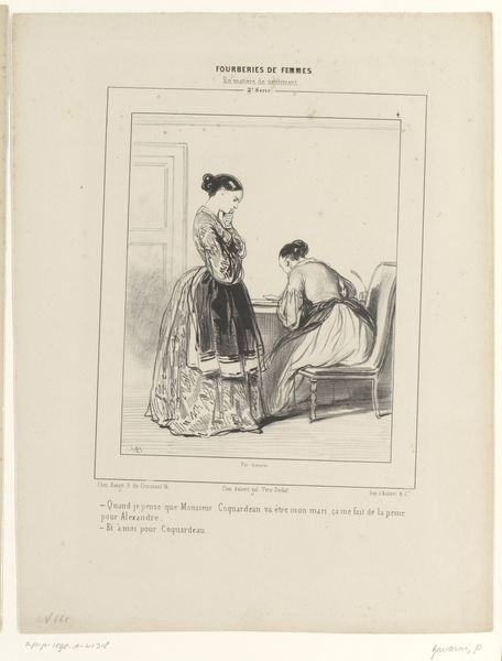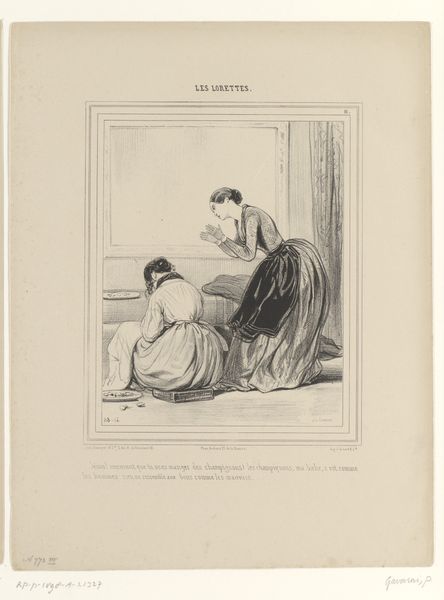 This lithograph was made by Paul Gavarni, sometime in the mid-19th century. The lithographic process involves drawing on a stone or metal plate with a greasy crayon, then using ink to transfer that image to paper. Gavarni was a master of this technique, and the many lines in this print allowed him to create subtle tonal gradations and textures. Look closely, and you will see that the paper itself is integral to the process. The texture of the paper allows the ink to sit on the surface, giving the image a unique visual quality. Consider the social context of this image. Gavarni's work often depicted scenes of Parisian life, including the lives of working-class women. Here, we see a woman, possibly a courtesan, kneeling to speak with a man reclining on a couch. The artist's skill in lithography allowed him to capture the nuances of this interaction, and its relationship to the wider social issues of labor, politics, and consumption. This work is a testament to the power of materials, making, and context in understanding the full meaning of an artwork.