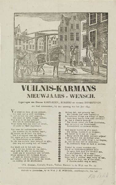 Curator: This is an engraving titled "Nieuwjaarswens van de vuilnismannen van Amsterdam voor het jaar 1844," essentially "New Year's wish from the Amsterdam garbage collectors for the year 1844." Editor: It has a dark, gritty feel to it. The lines are very defined. The cityscape, though, gives a quaint vibe—makes me think about public services in the context of class and community. Curator: Indeed. The print, created sometime between 1843 and 1844 by an anonymous artist, depicts precisely that. Notice how the supposed "common workers" are the ones offering their best wishes to the citizens. The act itself becomes a potent symbol. Editor: It flips the power dynamic, doesn’t it? These workers, who are usually overlooked, are elevated to a position of cultural importance. Their "wish" isn't just a pleasantry; it’s a reminder of their vital role in the city's well-being. What an unexpected genre-painting scene with political undertones! Curator: And that ties to symbolic purification – of cleaning up the mess of the old year, both literally and figuratively, which extends back to ancient cleansing rituals from well beyond Dutch culture. Their presence reinforces the idea of starting anew, cleansed and hopeful, a tradition deeply rooted in our cultural memory. The image of their humble yet necessary work stands for order. Editor: But who are they really addressing? Is this genuine goodwill, or does it mask a plea for better treatment? It could point to the uneven power dynamics that allow the upper class to dictate work conditions to those very sanitation workers who serve them, especially with the text dedicated "to the Merchants, Citizens and other Residents of the City of Amsterdam." Curator: Possibly a bit of both. There’s the social commentary, layered within conventional iconography. Think of the garbage cart and the way it frames their profession - as the bearer of symbolic as well as material waste. Even the dog, a frequent companion in cityscapes, perhaps offers some indication of "domestic" issues. Editor: Interesting points. It's fascinating how one scene combines New Year's greetings and workers’ conditions. Next time, let's research more of these prints and uncover the hidden voices of common labourers in society. Curator: A brilliant idea. There’s much more than meets the eye, which offers so many avenues of cultural and visual examination.