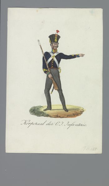 A. Courtois created this print depicting a Drum-major in full uniform, but without a specific date we must look to the details of the image itself to understand the cultural context. The print shows a Dutch Drum Major, resplendent in a highly ornamented uniform. The tall fur hat topped with a plume, the gold epaulettes, and the white sash speak to the importance of military spectacle. The drum major, positioned in front of the drummers and the company of soldiers, functions as a figurehead, embodying the military values of order, discipline and honor. Prints like these served multiple purposes. They documented the uniforms of different regiments, contributing to a sense of military identity and pride. They also circulated as popular imagery, reinforcing the prestige of military service. Analyzing such prints requires close attention to the details of dress, weaponry, and social context, as can be found in regimental histories and collections of military ephemera. Drum-major in Full Uniform offers a window into the visual culture of the Dutch military and its role in shaping social perceptions of power and authority.