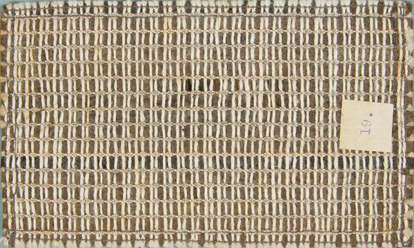 Editor: This is Anni Albers' "Sample of Bronze and White Wall Material." It's a small woven piece, very tactile. It makes me think about domestic spaces and functionality. What’s your interpretation of Albers’ work? Curator: Albers challenges the hierarchy of art and craft. Weaving, historically associated with women's labor, becomes a powerful medium for exploring modernist abstraction. How does its repetitive structure speak to larger social systems of production? Editor: It's like a grid, but softened. Maybe the imperfections represent resistance? Curator: Precisely. Albers is subverting the rigid, male-dominated Bauhaus ideals through a traditionally "feminine" craft. It's a quiet but insistent act of rebellion. Editor: So, it's not just a sample; it's a statement! Curator: Exactly! It encourages us to question what we value and why, and to recognize the political power of marginalized art forms.