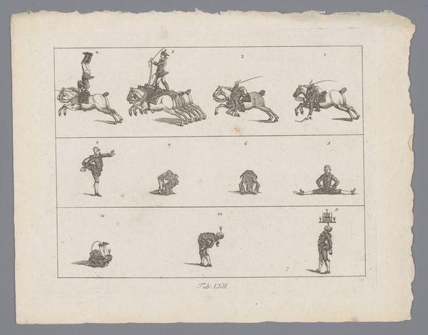 Jules-Robert-Pierre-Joseph Challamel created this work, "Negen studies van soldaten, ruiters en wandelaars" which translates to "Nine studies of soldiers, riders and walkers," using pen and ink. Challamel was a 19th century French artist and writer, often focusing on military subjects and historical scenes. The artwork gives us insight into the romanticized image of soldiers at the time. The figures in the middle of the sheet seem to represent this romantic view. They are likely a military man and his lover. The historical context of this work is around the time of vast social change in France, as well as the rise of new military technologies. Challamel’s subjects are more generic types, rather than portraits of specific individuals. The artist shows the soldiers as archetypes, figures of duty, honor, and, perhaps, also of a certain social standing. In its delicate lines, this image conveys an emotional sense of nostalgia and perhaps a commentary on the changing face of warfare.