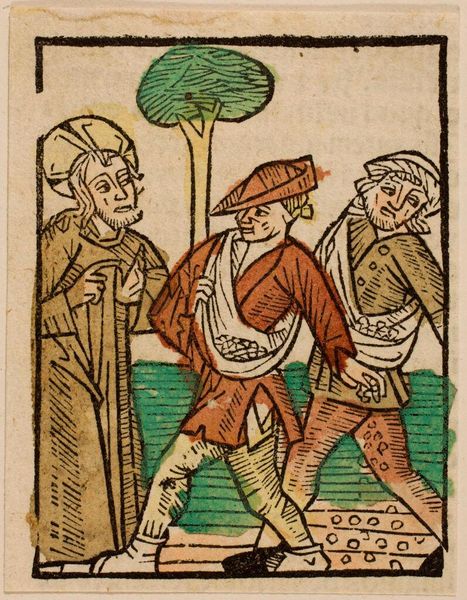 Editor: Here we have Illustration VIII by an anonymous artist. I’m drawn to the stark lines and the almost child-like quality of the figures. What stands out to you in terms of its formal qualities? Curator: Consider the relationship between line and color. The dominant black lines delineate forms, yet the washes of green, red, and yellow operate independently, almost disrupting the illusion of depth. Editor: So, the color isn't necessarily defining the forms, but creating a tension? Curator: Precisely. Note also how the diagonal lines of the figure carrying the wood intersect with the vertical lines of the figures standing. This creates a dynamic, albeit compressed, space. The composition leads the eye across the surface plane. Editor: That's fascinating. I was so focused on the figures, I missed the way the lines create such a dynamic tension. Curator: Indeed, it's a testament to the power of formal analysis. I appreciate the opportunity to view the artwork through a new lens.