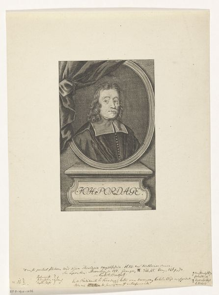 Curator: This print, etched by Robert Boissard between 1597 and 1599, depicts Matthäus Zell. Editor: It's quite severe, isn't it? Stern, yet meticulously crafted. The level of detail is impressive for an engraving, and he appears thoughtful but rigid. Curator: Zell, an influential clergyman during the Reformation. Boissard captures him framed within an archway of symbolic foliage and pillars, a style that elevates the sitter while containing him. Note how he is presented with his books and writing instruments. Editor: Books as signifiers of authority and learning, definitely. It's impossible to view this without acknowledging the deeply turbulent times of the Reformation, where religious and political identities were violently contested. His severity becomes quite understandable in that light. Curator: Absolutely. Consider the visual weight given to the objects, a symbolic language denoting his position and beliefs. He literally holds the book, thus embracing learning but also his power over interpretation. Even his clothing indicates status within the Church. Editor: It speaks volumes. A portrait wasn't merely a likeness then; it was an argument, a statement. What does it mean, in his social position, to commission such a deliberate image? He's aware he's crafting his place in history. How fascinating he appears so austere, with so little visual flourishes. The work conveys less personality and more resolve. Curator: Perhaps he wished to communicate conviction over emotion. Engravings were also relatively accessible. Prints could circulate ideas further afield. Editor: Yes, by controlling his image, and carefully managing symbols. He controls his representation. These visual artifacts were vital tools in disseminating information during a period of upheaval. He knew the value of a controlled narrative, of visual propaganda. Curator: I think the engraving captures a pivotal historical and theological moment through symbolic choices, making it a very revealing representation. Editor: It’s a great reminder that any artistic expression, however apparently simple, echoes complex socio-political landscapes, as well as of the power of visuals.