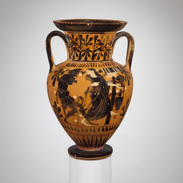 This terracotta neck-amphora, a jar of Nicosthenic shape, was made by the Class of Cabinet des Médailles 218. The jar's shape is a feat of hand-thrown clay, its walls evenly thin, its curves swelling and tapering with controlled grace. Once formed, the terracotta was fired to a warm, porous orange. The vase was then painted using a slip, which is a liquid clay, to create the figures and the decorative elements. These areas, now black, were applied with the precision of a practiced hand. The scenes of conflict and mythology aren't just painted; they're built into the identity of the vessel. This wasn't merely an aesthetic object, but a functional one, made for containing precious liquids. The skilled labor, the careful design, and the embedded narratives speak to a society that valued both utility and art, challenging our modern separation of craft from high culture.