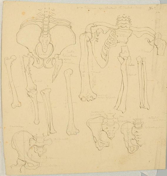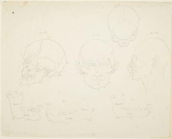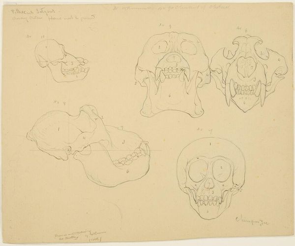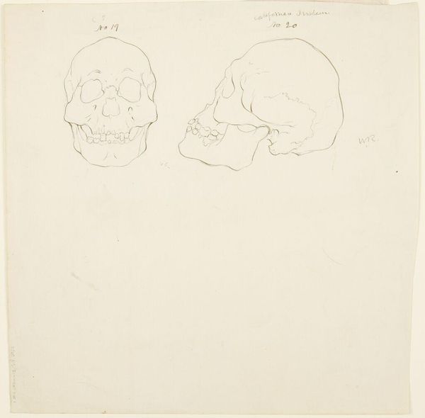 Curator: This sketch, by William Rimmer, presents primate skulls intended for his “Art Anatomy.” Their stark simplicity is immediately striking. Editor: Yes, a chilling starkness. Even in outline, the skulls possess a potent symbolism, reminding us of mortality and the primal underpinnings of existence. Curator: Rimmer's interest in anatomy reflects a 19th-century fascination with the body's inner workings, but also his own labor, teaching and producing didactic materials for other artists. Editor: The skulls themselves become potent symbols—of death, of course, but also of knowledge, the pursuit of scientific understanding, and perhaps even a memento mori. Curator: Consider the labor invested in creating these teaching aids; the process and the material realities behind them. Editor: Indeed. This sketch becomes not just an anatomical study, but a meditation on the human condition. Curator: Quite so. Rimmer’s skillful line work gives us both. Editor: A somber yet thought-provoking piece.