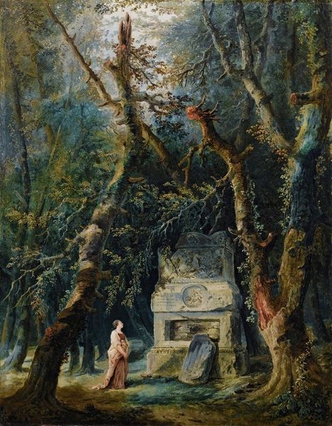 Curator: Diego Velázquez transports us to the Gardens of the Villa Medici in Rome in this oil on canvas, likely painted around 1630. It’s an unusual piece in his body of work. Editor: Unusual indeed. My immediate reaction is a feeling of subdued calm—almost melancholy. The colors are muted, and there’s this hazy light…it’s dreamlike. Curator: Yes, that hazy quality softens the architectural rigor of the villa and the precisely arranged gardens. Look how he uses light and shadow to create depth, drawing the eye through the archway and into the distant landscape. Editor: It's as if he's painted a stage set. Two figures populate the foreground, seemingly unaware of each other, adding a layer of narrative ambiguity. Who are they? What’s their story? Curator: We don’t know for sure, and that's part of the magic. Velázquez wasn't interested in storytelling here, I think. He was captivated by the light, the atmosphere, the way the garden itself created these layered spaces. It's a very modern sensibility for its time, don’t you agree? Editor: Absolutely. You can feel him exploring pure visual sensation, almost prefiguring Impressionism centuries later. There's something very immediate and visceral about the brushwork, too, the roughness, particularly in the foliage and the figures. He wasn’t striving for perfect representation. Curator: Not at all. And that's why it still resonates so powerfully today. This isn't just a picture of a garden; it’s a feeling, a moment in time captured with breathtaking sensitivity. It is like looking at it during a beautiful, sun-drenched afternoon and everything moves slowly around you, including time. Editor: This piece demonstrates how Velázquez's mastery lay not just in portraying grand subjects but also in finding profound beauty in the ordinary. And, to experience these gorgeous gardens along with all of the hustle-bustle surrounding these busy fellas… What a gift!