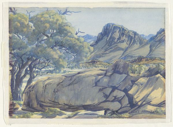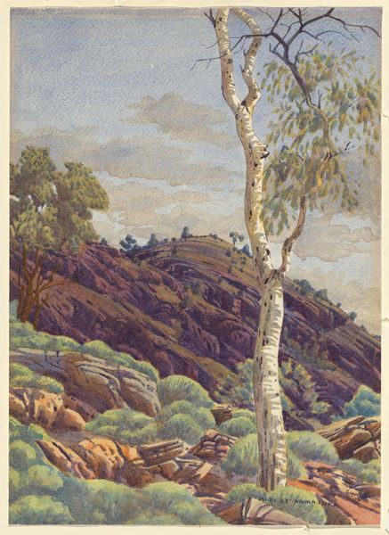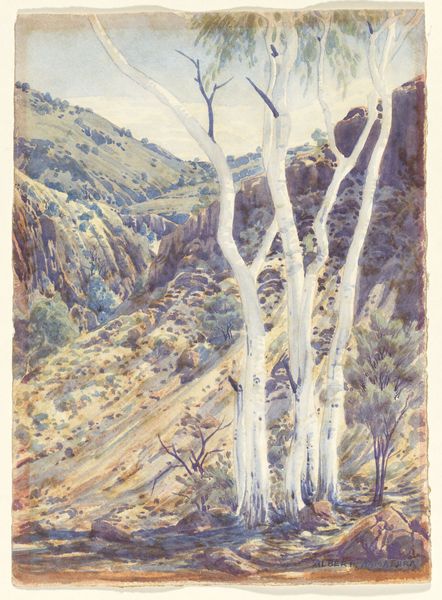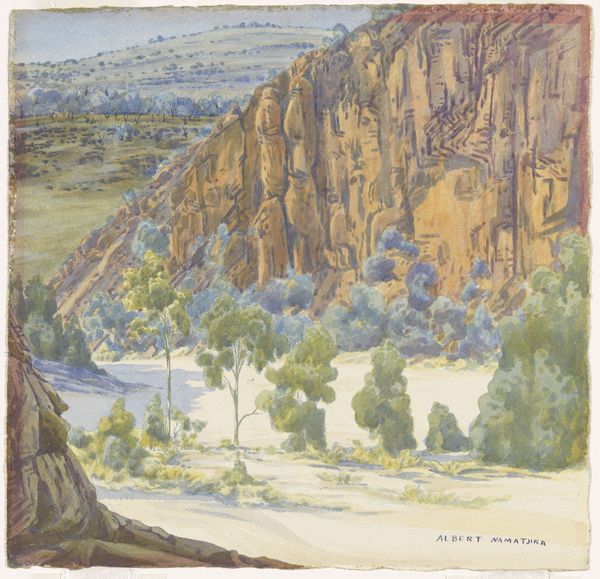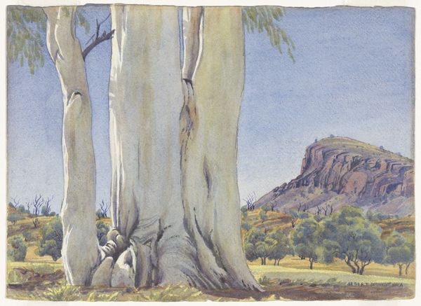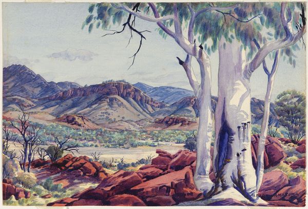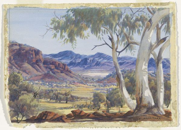 Curator: Well, the palette certainly captures something...a certain arid vastness? Editor: Indeed. This watercolor, 'Untitled Landscape (Ntaria),' from 1956, is by Albert Namatjira. Notice how he deploys realism to bring central Australia to life, using the plein-air style to achieve this immediacy. It seems such an unembellished transcription, no? Curator: Unembellished maybe, but also carefully constructed. Look at those ghost gum trees, they punctuate the foreground, but lead my eye almost as heralds. The pale trunks against the fiery landscape create such dramatic contrast, a real visual pathway. Editor: It's true, these represent something deeper. Ghost gums have long acted as totemic images for Aboriginal people, connecting ancestral stories to these visible forms. Namatjira gives these ancient images new agency. But what do you mean, visual pathways? Curator: Well, consider this too. The rugged, ochre cliffs and distant purple mountains… it’s as if the scene is consciously framed, guided by the trees, drawing me inward, towards what lies further in the distance. Doesn't that feel like how cultural identity can be held within a landscape, too? Editor: Absolutely. And you can see how Namatjira adapted European watercolor techniques to portray the specific light and color of his homeland. A new and hybrid aesthetic which allowed a public to "see" and perhaps access Indigenous landscapes in a new way. Curator: Hybrid is spot on. These aren't just geographical locations; they're sites of memory, both personal and collective. This image, I think, transcends simple representation—it actively shapes cultural understanding. What’s your impression? Editor: Mine, also changed by talking with you! These landscapes certainly were deployed politically. Serving both to represent Aboriginality on one hand and on the other to sell an untouched, ancient vision of Australia as nation. Curator: Absolutely. This landscape then is much more than watercolor on paper.