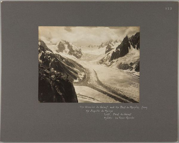 Curator: This photograph, by George Perry Ashley Abraham, captures "Looking S. by W., the Aiguille du Géant from the slopes of the Aiguille du Tacul." Editor: It evokes a feeling of solitude and immense scale. The sharp peaks piercing through the sky contrast with the smooth, vast expanse of snow. Curator: The romanticized concept of "the sublime" is essential here, particularly within the context of Victorian-era exploration, where landscapes became sites for asserting power. Editor: The mountain as a symbol of the untamed, then. It certainly reflects a human desire to grapple with the magnitude and indifference of nature. It's interesting to consider how differently we understand those landscapes now in an era of environmental precarity. Curator: Precisely, and the photograph's muted tones, emphasize the alienating grandeur of these spaces. Editor: Yes, it's a powerful reminder of both our insignificance and our enduring fascination with the natural world.
