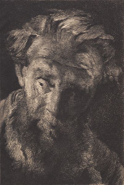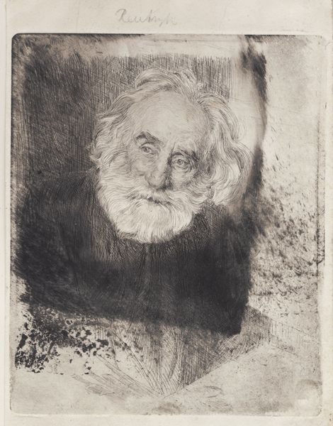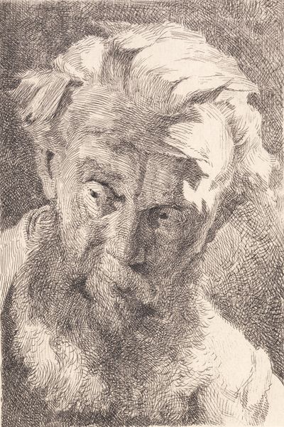 Curator: Well, this looks like a soul-searcher, doesn’t it? This etching, crafted in 1898 by Frans Schwartz, is titled "Gammel skægget mand, der ser til siden," or "Old bearded man looking to the side." Editor: Yes, there's something weighty about this one. It feels melancholic, almost mournful. The monochrome palette definitely contributes to that. And that texture—rough, like the character’s life etched onto the plate itself. Curator: It's certainly striking how the medium echoes the subject. Etching is such a process of controlled decay, really. What kind of cultural echoes do you perceive coming through from it? Editor: Decay is a beautiful word for it! The lines aren’t just lines—they’re little stories, little scars maybe. There is something biblical about his age and expression—like a weary prophet who has seen too much. The Realism gives him such a stark sense of truth, doesn't it? Curator: Absolutely. And think about what it meant to portray age and experience with such raw honesty at the end of the 19th century. A period of great transformation and societal reckoning. What kind of personal effect do you think it has on the viewers, then? Editor: For me, it prompts reflection. This guy looks like he is grappling with something internal. And he invites you into that space of introspection. We project, I think. Is that his sorrow, or our own reflected back at us? It's pretty powerful stuff for a black and white etching. Curator: A conversation across time, perhaps. Schwartz captured a timeless element of human existence. It reminds us, ultimately, of shared mortality and interiority. Editor: Yes, in a few lines he managed to remind us that our burdens and vulnerabilities are deeply interconnected across time and history. Curator: And, perhaps, gives us solace knowing we’re not so alone in facing them. Editor: A rather gloomy, but profound realisation. I think I need a coffee now.