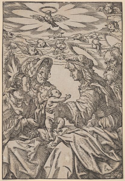 Curator: This is Giulio Bonasone’s "The Holy Family with Mary Magdalene and John the Baptist who embraces Christ," created in 1543. It is currently housed here at the Metropolitan Museum of Art. What's your initial take? Editor: I’m struck by the pervasive sense of quiet contemplation. Despite the active embrace between the two children, there's an overwhelming feeling of stillness, of suspended time, even within a larger composition filled with many figures. Curator: Interesting observation. From a material perspective, this is an intaglio print—a process involving engraving into a metal plate. Look at the density of the lines, the sheer labor involved in creating this image, and imagine the Renaissance workshop where it was produced and the network it took to circulate and distribute this imagery! Editor: Absolutely, and that labor translates into visual density, enriching the image's symbolic weight. John embracing Christ speaks volumes. It prefigures the baptism, yes, but also symbolizes profound affection and mutual recognition of their intertwined destinies. And notice Mary's book? She is both learned and prophetic. Curator: And what do we make of that water jug? The inclusion of domestic items and their circulation within such refined sacred themes is also relevant, I believe. We must consider how objects obtain symbolic and, dare I say, economic significance. Editor: The jug alludes to purification, a vital aspect of religious practice and a precursor to baptism. But I am especially interested in the rainbow pictured. It's often interpreted as God's covenant, representing hope and reconciliation, but Bonasone subtly positions it in the background as a celestial confirmation of Christ’s purpose on Earth. The castle or fortress visible is also suggestive and might symbolize the church’s defense of the faith. Curator: So you see how the Renaissance world used materials – printed images circulated through the growing commercial networks – to reinforce ideas. They served the consumption of particular symbolic languages through art. These processes would impact history irrevocably. Editor: Precisely! And recognizing the depth within these images—built over time with consistent application and careful selection of motifs, reinforces art's role as a carrier of memory. Curator: Thanks for highlighting the visual intricacies; it allows one to reflect on material conditions and what those engravings would inspire. Editor: The beauty and nuance of the symbolic conversation is what endures with the test of time.