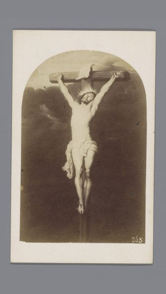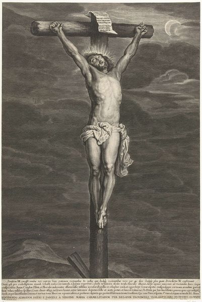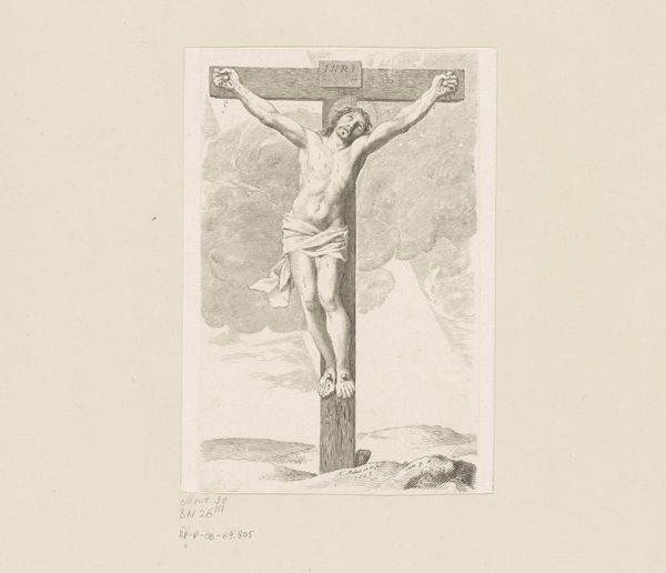 Antonio Dalco created this print, "Christ on the cross, a town in the background, after Reni," sometime in the 19th century. The composition presents a stark vertical thrust of the cross against a turbulent sky, balanced by the distant, serene town. Dalco masterfully uses light and shadow to guide our eyes, beginning with the illuminated figure of Christ, then moving towards the dramatic clouds. The artist employs a semiotic vocabulary wherein the cross symbolizes suffering and salvation, while the town embodies human civilization and continuity. Christ’s body, rendered with meticulous anatomical detail, serves as a focal point, drawing attention to his physical and spiritual sacrifice. Yet, the somewhat theatrical pose and idealized form challenge a singular interpretation of Christ's suffering. This print transcends religious iconography, inviting a deeper contemplation on the interplay between suffering and transcendence.