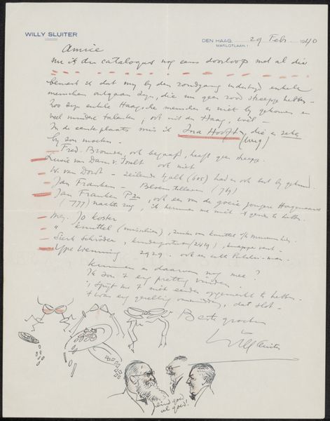 Curator: Well, this piece, located in the Rijksmuseum, is titled "Het stokske van Johan van Oldenbarnevelt met het gedicht van Vondel op het stokske, 1619." It's attributed to an anonymous artist and thought to originate from the 19th century. Editor: My initial reaction is that of looking at a handwritten artifact of personal, maybe even melancholic significance. The drawing seems fragile, emphasized by the aged paper and fading ink. Curator: Indeed, it’s rendered with ink and pencil on paper, giving it a delicate texture. The dominant element, aside from the handwritten script, is the drawing of a stick on the left-hand side. Considering that this portrait style emerged during the Dutch Golden Age, the line work appears meticulous despite its imperfections. Editor: For me, the inclusion of textile qualities with the "aged paper," introduces complex signifiers. I notice a clear, intentional "abstraction" as listed among the artwork's themes, and wonder about its link with Renaissance portraiture. Can you help me unpack this link, with its apparent tension between realism and symbol? Curator: Let's look at the interplay between the object and the inscription, "Het Stokske." Considering that the artwork displays poetry by Vondel, and referencing Van Oldenbarnevelt, its significance resides beyond its visual characteristics, engaging deeply with themes of loss and remembrance embedded in 17th-century Dutch history. Editor: This sheds a totally new perspective. I think the context of Northern Renaissance also helps. Suddenly, it's not just an image but a curated memorial, speaking volumes about how political figures were publicly grieved and memorialized in that period. It reminds me about our responsibility of documenting and preserving cultural heritage through our institutions, such as museums. Curator: Precisely. It transforms a simple drawing into a powerful cultural object. I'm now thinking about the way the linear abstraction functions within its own aesthetic system of expression. It suggests how artistic styles are adapted to social and emotional contexts. Editor: I see it as how art serves commemorative purposes while subtly navigating sensitive social terrain through material form. Curator: An incredibly thought-provoking piece!