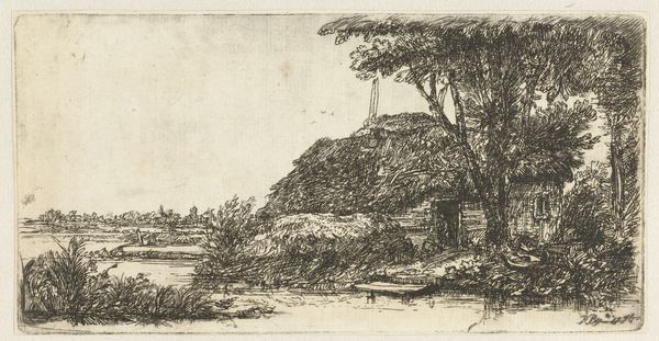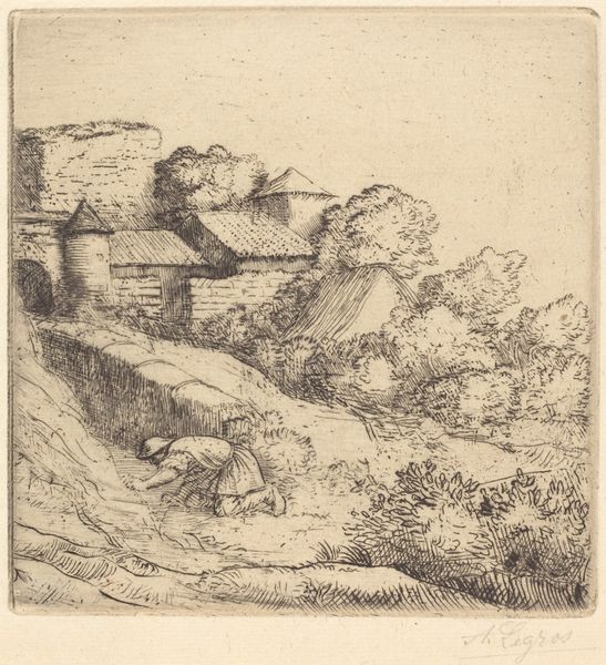 Editor: Alphonse Legros' "Pigeon Tower," done as an etching in the Impressionistic style, feels incredibly intimate. It's almost like a stolen glance at a secret place. The density of the lines really gives it a brooding atmosphere. What strikes you about this piece? Curator: Brooding, yes, exactly! It's a world rendered in whispers. Look at how Legros uses line, a veritable choreography of marks. Notice how the dense cross-hatching suggests form but simultaneously dissolves it. It’s solid and fleeting all at once! Do you get a sense of melancholy from it? Perhaps even a sense of forgotten stories clinging to the structure? Editor: Absolutely, there is a somber quality. It makes me wonder what's become of the tower. Why do you think Legros chose this subject? Curator: Ah, there's the delicious mystery. I believe it wasn't necessarily about a specific place, but rather a mood, a fleeting impression captured and immortalized in ink. Perhaps it speaks to the Romantic era's fascination with ruins, with the poignant beauty of decay and time's relentless march? I almost feel as though I can smell the damp earth! It is interesting that the piece is undated, what implications would this have for the audience? Editor: It leaves us with even more questions. Maybe Legros wanted the image to transcend a specific moment. That makes the timelessness you mentioned feel even stronger. Curator: Precisely. The ambiguity invites us to project our own narratives onto the landscape. Art is, after all, a conversation – one we are now actively participating in. Legros simply gave us the opening line, full of possibilities and suggestive traces. Editor: I came in thinking it was a straightforward landscape, but now I see it’s about the feelings the scene evokes, not just the scene itself. Curator: Indeed. It is more of a "mindscape." It leaves a slightly different mark on everyone, like a secret shared only between the viewer and the artist.