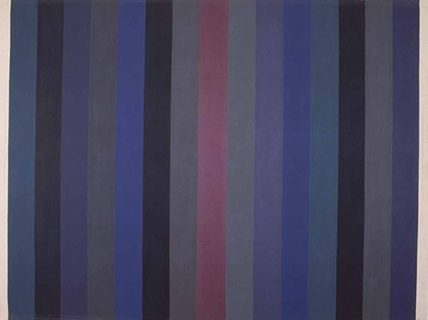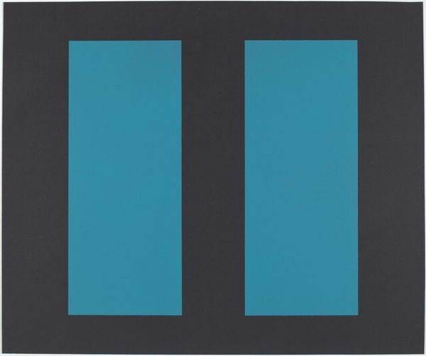 Editor: We're looking at "Parallèles bleues" by Guido Molinari. It's an acrylic painting featuring simple, vertical stripes of varying blues and blacks. I find its starkness somewhat… intense. What do you see in this piece? Curator: I see a visual manifesto of the Colour Field movement. Molinari’s work strips painting to its bare essence: color and form. The parallel lines are less about aesthetics and more about disrupting traditional power dynamics within art itself. What societal norms do you think Molinari is challenging with his work? Editor: Well, its abstraction certainly bucks the representational tradition. Perhaps he's rejecting art that reinforces established narratives, focusing instead on pure sensory experience. The blues and blacks don't depict anything literal, right? Curator: Precisely. Think of Clement Greenberg’s formalist criticism at the time. Molinari moves beyond storytelling or illusion. Instead, it presents a flat plane asserting its presence. The hard-edged stripes offer no depth, only surface. Where do you see this challenging viewers' expectations? Editor: I guess we're used to seeing art that 'says' something, tells a story, but this work seems to resist easy interpretation. It is confrontational. I originally interpreted the stripes as static but now they have dynamism! Curator: Exactly! These "simple" visual arrangements engage with ideas around structuralism and semiotics, even subtly raising questions about race through the prominence of black. This pushes against any simplistic readings, doesn't it? Editor: Yes, absolutely. It's fascinating to consider how what appears simple can be so layered in meaning. I never thought a bunch of colored stripes could engage with so many things! Curator: Indeed. By removing the representational crutches, Molinari compels us to confront the power structures inherent in how we perceive and interpret art. I look at his painting, and can imagine a call for intersectional progress. Editor: Thanks so much, I've completely changed my original read. The layering within minimalism is amazing.