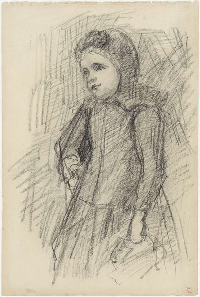 This drawing, "Girl Leaning Against a Tree", was made by Jozef Israëls. Here we see a young girl, her wooden shoes firmly planted on the ground as she leans against the rough bark of a tree, seemingly lost in thought. This pose, of leaning or resting against nature, echoes through art history, a motif resonating with a sense of introspection and connection to the earth. Consider the classical figures of nymphs and shepherds in pastoral scenes, often depicted reclining against trees, symbols of harmony with nature. Yet, here, the girl's sturdy shoes root her in a reality far removed from idyllic fantasy. The tree, a symbol of life and growth, also hints at the passage of time, and perhaps, the girl's own journey of maturation. The emotional weight of this image lies in its subtle evocation of childhood reverie, and a profound sense of being grounded. This simple scene speaks to the cyclical and evolving relationship between humanity and nature.