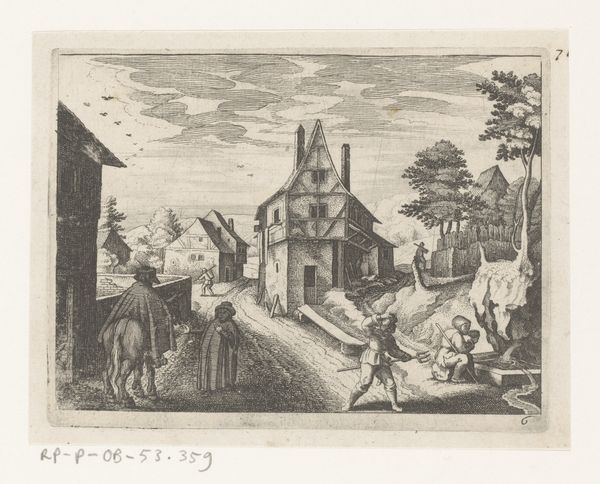Editor: This etching by H. Rosenkilde, titled "Byinteriør med lade og Jesu fødsel" from 1746, presents quite a detailed scene. It’s busy! There’s a well, several buildings, figures interacting… It feels like a slice of life. How do you interpret this work? Curator: This etching speaks to the persistence of symbolic landscapes within seemingly mundane scenes. The title references the Nativity, but where is it? Look closely: the manger scene is nestled *inside* the larger depiction of daily life. Editor: Oh, I see it now, almost hidden within the barn! Curator: Precisely. This juxtaposition is key. Rosenkilde embeds the sacred within the profane. How does this visual choice influence your understanding of the depicted scene? Editor: It blurs the line, making the everyday actions seem imbued with a kind of divine significance. Curator: Exactly! Notice, too, how Rosenkilde uses architectural elements to guide our eye— the archway, the ladder... Are they merely structural, or might they carry deeper symbolic weight? Editor: The ladder could represent ascent or striving. And maybe the archway symbolizes a transition or portal? Curator: A beautiful observation! In art, familiar symbols often take on unique connotations by their use and placement. We could consider how viewers from that period perceived those common architectural elements. Editor: This really changes my perspective. I see the world within the image as a symbol itself! Curator: Indeed, and it also begs a bigger question. How might contemporary viewers re-interpret these lasting symbols? Editor: I never thought about the layers of symbolic meanings behind such a seemingly ordinary scene. I'll definitely look at art with new eyes now!