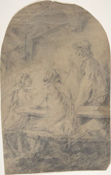 Editor: This is "Leonora Christine Receives a Visit in Prison by Queen Charlotte Amalie," created sometime between 1843 and 1917 by Kristian Zahrtmann, using charcoal and pencil. There’s something really haunting about the way Zahrtmann captures this historical encounter. You can almost feel the coldness of the prison and the rigid power dynamic through the composition. How do you interpret this work through the lens of its historical context? Curator: It's interesting you pick up on the power dynamic. This drawing really highlights the fraught relationship between the monarchy and individuals deemed threats to the established order. Leonora Christine, daughter of King Christian IV, was imprisoned for years due to her marriage to a man accused of treason. Zahrtmann, working much later, re-imagines and perhaps critiques this history. The drawing serves as a reminder of the public spectacle surrounding imprisonment and the role of visual imagery in shaping historical narratives and public perceptions of power. Note the academic style, emphasizing the historical 'truth'. What does that choice suggest about his intention? Editor: Perhaps it’s an effort to legitimize his own commentary by aligning it with established artistic conventions, aiming for greater social impact? Is this kind of narrative common at the time? Curator: Exactly! Artists often used history painting to engage in contemporary political discourse. By depicting a scene from the past, Zahrtmann subtly critiques the exercise of power and questions the construction of historical memory. The use of charcoal and pencil allows for both delicate detail and stark contrasts, enhancing the dramatic tension. I also wonder about Zahrtmann's personal connection. Was he a supporter of certain social changes? Whose stories get told, and why? Editor: That makes me think more deeply about how historical artworks are never neutral. They reflect both the subject's time and the artist's. Thanks for making that clear! Curator: And in thinking that way, we make sure museums play their critical role in the contemporary social arena.
