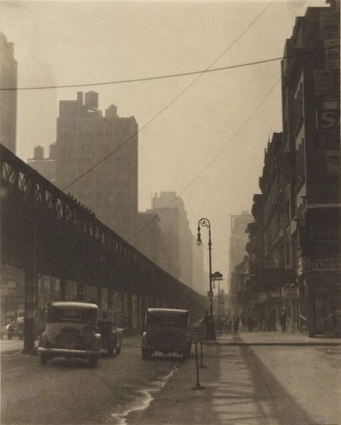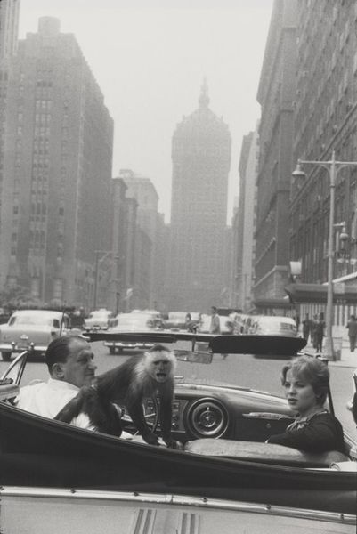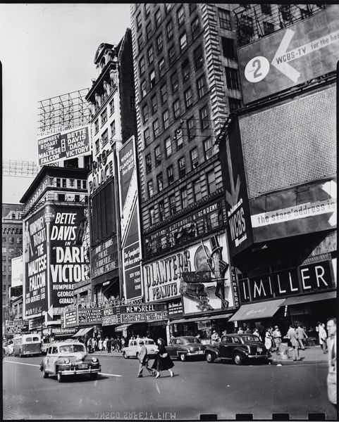 Curator: There's something undeniably lonely about this street, isn't there? Editor: It has that Edward Hopper quality – early morning quiet. We're looking at David Vestal’s "6am, 6th Avenue & 23rd Street, New York," a gelatin silver print he captured in 1965. It speaks to the in-between moments, when a city breathes before it roars. Curator: Loneliness is a thread throughout cityscapes, it seems. That solitary figure crossing the street, dwarfed by the architecture, becomes almost a symbol. A visual marker, the transient human experience navigating an urban immensity. Editor: Exactly. Think about the power dynamics in play, even at that early hour. We've got the National City Bank, that towering hotel sign… institutions looming large. The street itself, 6th Avenue, it’s a corridor carved by capital and commerce. It presents itself through vertical dominance – literally establishing place in the culture as its street lighting and infrastructure reflect an early stage of modernity. Curator: The streetlights almost become a path or constellation, don't they? Little shining lights like distant stars—or perhaps guiding lights toward consumer destinations, as suggested. Do the signs serve as religious symbols for others on similar journeys? Editor: Possibly! This pre-dawn stillness amplifies everything. What Vestal's camera captures so perfectly is the performance of it all. This isn't just a quiet street; it is constructed, waiting, almost expectant. Even the blurry movement suggests both progress and labor – all existing in liminal space before the opening of business. Curator: There’s a strong graphic quality too, the stark contrast really accentuates these geometries and almost creates a flattening of space within the image's overall perspective, so perhaps that flattening is another form of comment about our world—with only the symbolic present, leaving us to look backward to meaning? Editor: Perhaps. It reminds me that spaces like this are inherently charged, socially constructed. These "empty" spaces of transition only momentarily lack bustle before the city reclaims its role and voice of production and consumption. Curator: I'm moved by that solitude – the feeling of potential and emptiness that these images represent even today. It becomes an eternal space where meanings emerge from silence, allowing those spaces of labor to regain voice beyond commercial influence. Editor: Ultimately, Vestal gives us a space to consider who shapes urban narratives, and who is erased or absorbed into the relentless engine of the metropolis. The everyday becomes a field ripe for observation, for both critique and contemplation.