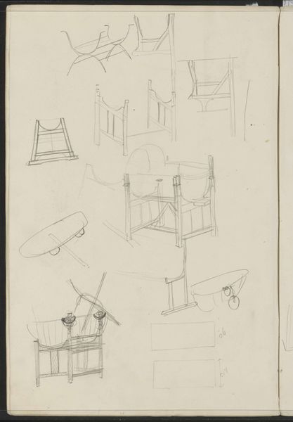 These chair designs were sketched by Carel Adolph Lion Cachet, but the drawings are undated. They're made with graphite pencil on paper, materials we all know well. But what can these sketches tell us about the chairs he envisioned? The artist clearly focuses on the structure and form. The lines are quick, capturing the essence of the chairs. Lion Cachet seems interested in the chair's strength and function, rather than surface decoration. It’s interesting to imagine the social context for these designs. Were these chairs intended for mass production, or bespoke pieces for wealthy clients? The simplicity suggests a move towards more streamlined, functional furniture. By focusing on material efficiency and structural integrity, Lion Cachet hinted towards a future where design and industry converged. It blurs the line between art, design, and craft, reminding us of the value of everyday objects.