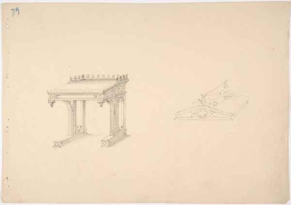 Curator: This detailed rendering offers us insight into furniture design during the period of 1800 to 1850. Known as "Design for a Gothic Desk and Two Low Chairs", this drawing utilizes graphite, etching, and pencil on paper. While the artist remains anonymous, this piece is held at the Metropolitan Museum of Art. What stands out to you initially? Editor: The desk looms large. It really dominates the space. And yet the chairs are delicate and surprisingly upright. It's austere but strangely inviting all at once. I want to know who designed this. Curator: Knowing its gothic inspiration, we can see an imagined power structure emerge when considering how spaces were conceptualized during that period. These structures—religious and domestic—largely ignored or disenfranchised entire groups of people. So the austerity may reflect this intentional hierarchy. Editor: Exactly. And how would these forms influence the user’s physical and intellectual relationship with writing, studying, or working? Who was invited to sit in those chairs, at that desk? Were women involved at any level, from conceptualization to execution? Was the very pose forced by these chairs implicitly masculine? It is tempting to see this sort of formality as another aspect of power. Curator: Absolutely, the clean lines and geometric forms characteristic of Neoclassicism further emphasize this sense of order and control. This type of furniture undoubtedly impacted how people physically and socially interacted with texts and ideas, perhaps encouraging a sense of rigid, authoritative learning. But what of the act of rebellion? Did these forms help those seeking power through more conventional channels? Editor: An interesting point. The fact that the designer remains unknown to us can serve as a crucial element for analysis. Their story is equally valuable in that the objects represented here may have served different purposes throughout varied intersectional perspectives. I find that element incredibly compelling. Curator: As we look at the fine line work on the page, what seems at first to be a sterile image opens up all kinds of questions. This Gothic desk and set of chairs gives us much to contemplate. Editor: I agree, there are stories lurking between the lines. And this artwork inspires the quest to unveil them.