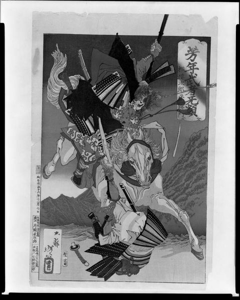 Editor: This diptych is by Utagawa Kunisada and is located at Harvard Art Museums. The figures seem to be caught in a moment of surprise. What's striking is the intricate detail in their clothing. What do you see in this piece? Curator: I see an echo of labor practices embedded in the very lines of this print. Consider the woodblock carving process itself – the skilled artisan meticulously transferring Kunisada's design, a process of both creation and reproduction intimately tied to the social context of its making and consumption. Editor: So, the process itself carries meaning? Curator: Absolutely. Look at the layering of patterns and lines, suggesting not just aesthetic preference but a complex interplay between design, material, and the hands that brought it to life. It speaks to a whole system of production and consumption. Editor: That’s a fascinating lens to view it through. Thank you! Curator: Indeed. The materials themselves tell a story.