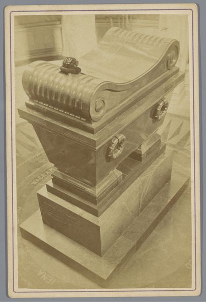 Curator: This gelatin silver print, taken sometime between 1860 and 1880 by Ernest Eléonor Pierre Lamy, depicts the bed of Napoleon Bonaparte in his bedroom at the Grand Trianon. Editor: There’s a stillness, a solemnity, that the monochrome tones emphasize. It's like stepping into a hushed room, preserved exactly as it was, expecting the Emperor to return any moment. Curator: Precisely. And it's essential to recognize that images like these, circulated widely during the latter half of the 19th century, contributed heavily to the construction of Napoleon as a historical icon, helping to secure and justify the rule of Napoleon III. The image is less about historical accuracy and more about cultivating a specific political narrative. Editor: Note also the objects chosen for inclusion: the Empire style bed with its scrolled headboard, the small, elegant table… Each piece evokes not just opulence but also Neoclassical motifs intended to align Napoleon with the grandeur of antiquity. It projects an air of legitimacy through carefully chosen symbols. Curator: Absolutely. And the romantic era framing creates intimacy. Photography in this period was rarely candid. The scene is deliberately composed to enhance an existing idealized image of a great man and to suggest proximity with power. It gives the average citizen access and helps solidify a sense of French identity deeply tied to this past. Editor: I'm intrigued by the somewhat blurry vase on the chest of drawers. Even the wallpaper seems strategically included, its patterns subtle enough not to detract, yet rich enough to signal wealth. Curator: Everything is curated to communicate prestige and enduring power. One must examine images like this with a critical awareness of the socio-political context in which they were produced and consumed. Editor: This examination highlights the image as a powerful artifact; it conveys a message, evokes memory, and continues to echo with imperial dreams and ambitions. Curator: A vivid reminder that images are rarely neutral. Editor: Indeed, a glimpse into carefully crafted myth-making.