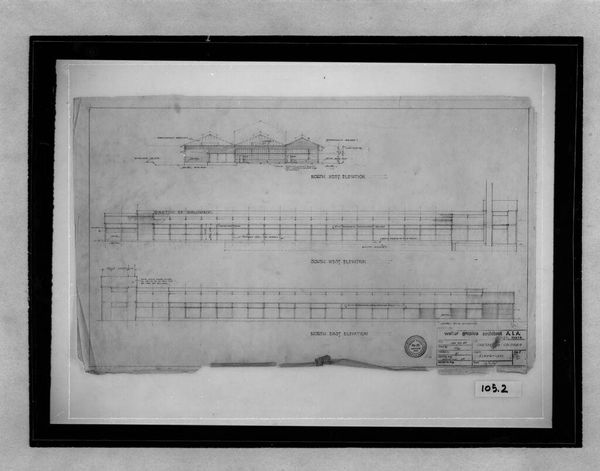 Curator: Here we have proposed elevations for an "Office Unit and Factory Building, Greensboro, North Carolina, 1944-1946," attributed to C.M.D. The drawing shows east and west views of the planned structure. Editor: It appears quite minimalist, almost stark. The emphasis on horizontal lines gives it a distinctly modern feel, even in this preliminary sketch. Curator: The architect clearly adheres to modernist principles. Note the absence of ornamentation and the focus on functional form. It reflects the International Style, a key development in twentieth-century architecture. Editor: Certainly, the design embodies the efficient, rational ethos of post-war industrial America. One wonders how this vision translated to the reality of the built environment in Greensboro. Curator: Precisely, and the play of light and shadow across these facades, even in this sketch, suggests a concern for the building's interaction with its environment, a very important detail. Editor: Looking at this rendering, I am reminded how architectural drawings are artifacts in themselves, documenting not only a design but also a particular moment in socio-economic history.