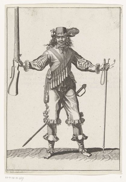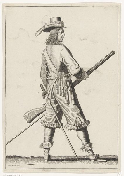 Editor: Here we have Petrus Rucholle's "Soldier Placing His Ramrod Into the Holder Under the Barrel of His Musket," created around 1645. The intricate lines of this engraving give the soldier an almost fashionable flair despite the subject matter. What stands out to you as you consider the piece? Curator: The first thing I notice is the clear attempt to portray the soldier not just as a fighter, but also as an agent within the evolving military culture of the mid-17th century. Look at the precision of his uniform and equipment, indicative of professional armies becoming more commonplace. Where do you think this image would have circulated and what purposes might it have served? Editor: Perhaps among other soldiers, as a kind of aspirational portrait? Or even for recruitment purposes? It does make soldiering seem rather...orderly. Curator: Exactly. Prints like this circulated widely. They served as models for military training, propaganda, and even as status symbols for officers. Note how the artist focuses on the act of preparing the musket. It’s a visualization of early modern military discipline being drilled into soldiers. This action emphasizes the evolving relationship between man and machine within the theatre of war. It marks a distinct period of technical and strategic changes. Editor: That's fascinating. It's easy to overlook the social impact of something as simple as a uniform or a specific method of loading a weapon. It’s interesting how art becomes documentation in unexpected ways. Curator: Precisely! By examining the cultural and social context surrounding such images, we understand better not just the depicted event, but the values and structures underpinning them. Images play an active role in shaping how society functions, forms relationships, and disseminates power. Editor: I will remember to analyze art’s wider role beyond its aesthetic attributes! Thanks for helping me explore these fascinating implications.