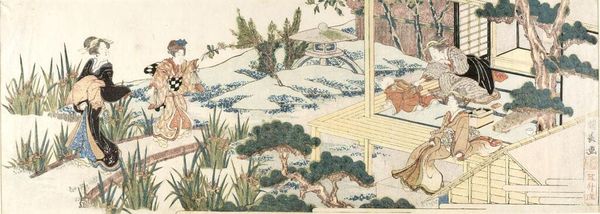 Curator: Here we see "Courtier Standing Outside Woman's Chamber, from the Tale of Genji(?)," attributed to Katsushika Hokusai. The print on paper is striking for its panoramic composition. Editor: It feels like a stage set, doesn’t it? The distant landscape, the interior scene, all framed like a dream, a whispered secret, or an imagined moment. Curator: Exactly. The narrative is built through layers. The architecture suggests separation and anticipation, a liminal space between interior and exterior worlds. Editor: That lone figure on the deck, he could be anyone: a lover, a spy, a memory. The woman indoors, she is obscured, a hidden desire maybe? The moon seems to be pulling the tides of his actions. Curator: Yes, the moon is a powerful symbol of longing and reflection in Japanese art. The pines too, represent constancy, watching this scene unfold, marking its passage across time. Editor: It’s beautiful how Hokusai manages to suggest so much with just a few lines and colors. It’s a gentle, almost melancholy echo of a story we can only guess at.