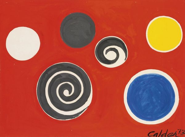 Curator: Right, let’s dive into this vibrant work, "Orbs on Green Ground," created by Alexander Calder in 1971. What springs to mind when you first gaze upon it? Editor: A jazzy playfulness! Like a troupe of circus performers balancing on a slightly unstable stage. There's an energy here that's instantly uplifting, isn’t it? Almost whimsical, a bold experiment. Curator: Calder was such a master of using simple forms to create such a sense of kinetic energy even in his static pieces, something he also explored via his wire sculptures. Here he deploys bright acrylic paint to depict a scene that vibrates with life. Look how the forms push and pull. This echoes a key moment when galleries started showcasing his wall-mounted artworks in his last years. Editor: You’re right. There is the push and pull here but I cannot shake my feeling of instability. Is it me or do those circles feel slightly off balance, especially with those loosey-goosey, unblended brushstrokes in the 'green ground' as it were? Curator: The deliberate naivety adds to its charm, I feel. It defies the mid-century tendency to perfect form. It challenges us to relax, embrace imperfection, not strive for balance at all costs. There is much more to this picture. Editor: A breath of fresh air amidst all that mid-century rigor, agreed. Though I wonder, did Calder mean to reflect society’s turbulent shifts during that time? The late 60s and early 70s were hardly balanced. Curator: Perhaps it reflects both! Art often holds multiple truths. The beauty of "Orbs on Green Ground" lies not in its definitive meaning but in its power to spark conversation, challenge our perceptions and invite delight. It mirrors the world with a mischievous grin, I believe! Editor: Leaving us with more questions than answers, which, if I may add, is exactly the point! I have a newfound appreciation for this vibrant experiment that’s anything but child's play. Thank you.