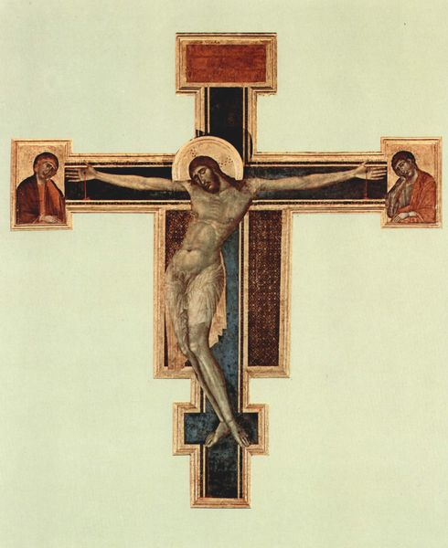 Editor: Here we have a Byzantine icon from around 1200, "Crucifixion," made with tempera. What immediately strikes me is the composition – the stark central figure contrasted with the surrounding figures and golden background. How would you interpret this work? Curator: Well, from a materialist perspective, I see a fascinating intersection of religious narrative and production. Consider the tempera itself – ground pigments, likely sourced locally, meticulously applied. This wasn't simply about representing a scene, it was about labour, material, and access within a specific social hierarchy in Egypt. Editor: So you’re thinking about the labor that went into making this object… Curator: Precisely. How the making informs our understanding. For instance, who commissioned this? Were they wealthy? The gold suggests so, pointing to a patron capable of commanding such resources. And think about the role this object would have played: was it meant for individual contemplation or communal veneration? Its presence at Saint Catherine's Monastery speaks to its connection to a community, but is that community just the monks themselves or a larger one, shaped through its circulation of similar icons? Editor: I see. It’s more than just the religious symbolism, it’s about the conditions of production, access, and use. What about the function of the icons for people who were maybe illiterate, to have visual access to Christian stories? Curator: Exactly! This extends beyond personal devotion; it shapes a collective identity through accessible imagery that reaffirms particular modes of religious production. We’re considering an economic and social role too: the dissemination of ideological material. And thinking of circulation -- I wonder how its existence here, in this location, shifts our interpretation, or whether our interpretations depend on access, authorship, trade… It never really ends, does it? Editor: Never. I see now, approaching it from a materialist viewpoint really unpacks a whole history that's embedded within this object. It is much more than it appears.