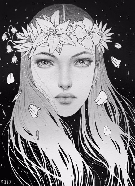 Sarah Joncas' monochrome drawing presents us with a face emerging from darkness, adorned with a feather earring. This symbol, light as a breath and imbued with the spirit of flight, has ancient roots. Feathers appear across cultures – Egyptian goddesses wore them as symbols of truth and justice. In Native American traditions, they embody a connection to the divine. Yet here, the feather's meaning takes a different turn, hanging suspended from the ear, a delicate ornament. The feather motif recurs, even in Botticelli's "Primavera," where Flora is adorned with floral and faunal motifs, symbolizing nature's rebirth and vitality. But how has it shifted? From symbols of power and divinity to decorative elements, evoking a sense of lightness. This subtle shift reflects a deeper psychological yearning for freedom. The image evokes a feeling of serene melancholy, engaging us on a deep, subconscious level, reminding us of the cyclical, non-linear progression of symbols, their resurfacing, evolution, and their ability to take on new meanings in different historical contexts.