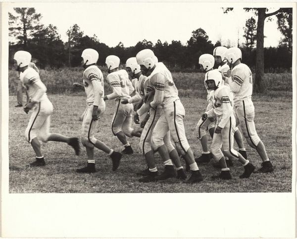 Curator: This compelling photograph, captured by Harris & Ewing, presents an intense moment: high school football players poised in scrimmage formation. Editor: There's a starkness to it, an almost ghostly quality, emphasized by the monochromatic palette. The texture of the grass is quite striking. Curator: Exactly. The image, while untitled, speaks volumes about American ideals of sport, competition, and masculinity. This raises critical questions about exclusion, gender norms, and the pressures placed on young athletes. Editor: And we can consider the means of production. It's a straightforward gelatin silver print; the darkroom process itself lends that striking contrast, heightening the sense of anticipation and physical strain. Curator: It's interesting to consider the image's context – who are these boys, and what socioeconomic forces shaped their access to this field and this sport? Editor: I agree, there's so much contained within the materiality, pointing towards those social structures. Curator: Indeed, it prompts us to examine the broader narrative of American identity. Editor: A potent reminder of the power of image-making.