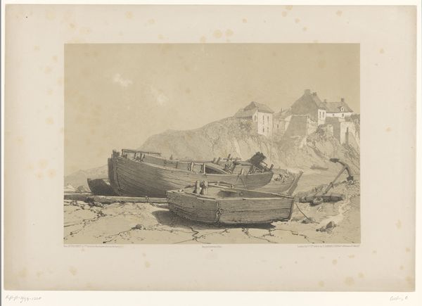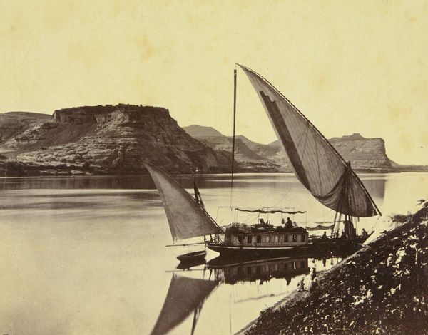 Curator: The atmosphere in this albumen print, "Veerpont bij Qasr Ibrim" by Francis Frith, dating from before 1862, is almost otherworldly, wouldn’t you agree? Editor: It's quite striking, a stillness pervades the image. The composition seems centered around the reflection on the water—the ripples disrupt the sharp mirrored quality. The tones feel muted, lending a certain softness. Curator: Indeed. Frith, renowned for his landscape photography and Orientalist leanings, has meticulously captured a specific locale here. The Qasr Ibrim fortress looms majestically in the background, its scale dwarfing the boat. Editor: Scale is precisely what interests me; the fort stands against the sky, the image divided in two like that seems symbolic. It's as if Frith wanted to communicate the grandeur and the perceived permanence of this ancient site compared to the temporary presence of those traveling along the Nile. Curator: You make an astute observation about Frith's intent. He, alongside other photographers of the period, played a crucial role in shaping Western perceptions of the Middle East, disseminating images laden with both documentary and romanticized viewpoints. What strikes you most about the composition? Editor: How Frith chose this seemingly odd angle—he must have been at water-level himself, yet angled off to the right bank as that catches the light, doesn’t it? And in framing the ferry juxtaposed with this relic of an ancient Nubian civilization, one cannot help but interpret it in terms of temporal contrast. Does the sharp reflection signify clarity, or does the subtle asymmetry hint at disruption, perhaps some sort of dissonance in our perception? Curator: An intriguing idea. While there's a tranquil veneer to the scene, it is compelling to contemplate that tension lurking beneath the surface, reflecting broader cultural encounters and imperial aspirations. Editor: Exactly. The quiet beauty holds something profound to say about history and interpretation. The print beckons to reflect not just upon what it shows, but the very act of its looking itself.