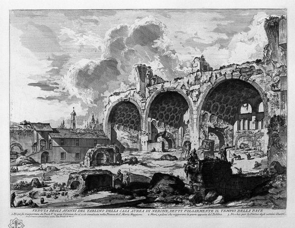 Curator: What strikes me immediately about this etching is the romantic desolation. Editor: I agree, the visual drama is certainly compelling. This is Giovanni Battista Piranesi’s “A view of the remains of two Triclinj who belonged to Nero`s Golden House," created in 1759. Piranesi masterfully captured not only architectural forms but also their decay. I'm particularly interested in the materials, specifically how Piranesi employed etching to articulate the ruinous condition of Roman architecture. Curator: Right. And looking closely, we can see small figures amidst these gigantic structures. The Golden House, once a symbol of imperial excess, is now in pieces, overgrown with nature. It evokes a feeling of melancholy but also of inevitable decline—a reflection on the transient nature of power. I see reflections of the enlightenment's preoccupation with history. Editor: Absolutely, it also highlights labor. Note the tiny figures painstakingly clearing debris; the consumption and subsequent repurposing of building materials by everyday laborers—highlighting how physical effort shapes the historical narrative. This also underlines a political critique about power imbalances. Curator: Yes, that tension between grandiosity and fragility really underscores Piranesi’s view on civilization itself. The layers of meaning that he has put into this work speaks about what comes to take over previous constructions, which could even talk about how systems are designed. Editor: Considering that the artist captured real, extant architecture—the materials already contained stories that the process and his representation augmented. How was this building constructed and then dismantled? Whose labor and material created it and then unearthed it? Curator: It definitely forces us to contemplate the complex relationships between time, power, and representation. Editor: Precisely, it urges us to see history not as a detached narrative, but as a sequence of human endeavors, labor, and materiality interwoven. It’s been illuminating looking at this piece through those different lenses. Curator: Agreed, it really provides an insightful intersectional approach to understand art's interaction with society.