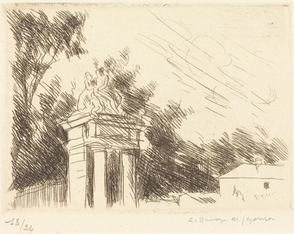 André Dunoyer de Segonzac made this etching of the Entrance to the Orangerie at Versailles using black ink on paper. Segonzac came of age artistically during the first World War and it marked him profoundly. Segonzac's generation was preoccupied with a sense of France's lost greatness. Versailles was an important symbol of French history and culture. The architecture represents the power and splendor of the French monarchy during its height. The Orangerie, originally built by Louis XIV, was a symbol of royal opulence. Segonzac finds an image of the past in his own present. Segonzac was deeply influenced by the realist tradition, focusing on scenes of everyday life and landscapes. As a historian, I would want to investigate the popularity of Versailles as a subject for artists during this period. Understanding the cultural and political climate of France in the early 20th century can shed light on why artists like Segonzac were drawn to such historical sites.