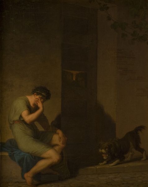 Curator: Here we have Enrique Grau’s “Boy With Umbrella,” a painting completed in 1964. Editor: The very first impression is arresting, isn't it? The rather frontal pose, the dark umbrella dominating the composition, and the smooth but unsettling skin tones give the whole piece an almost dreamlike quality. Curator: Grau’s works, and this portrait is a key example, often reflected on Colombian society and culture. Grau, after his travels to Europe, particularly to Florence, took influence of renaissance in his art, exploring themes related to class, identity, and social issues, so common to Colombian society during the mid 20th century. Editor: Absolutely. I am struck by the sharp contrast between the hyperrealistic, almost photographic depiction of the figure, particularly in the face, and the somewhat flattened perspective and limited color palette. It nearly renders the boy as a sculpture. Also, isn't that a coffee grinder in the back? It is such an unexpected detail. Curator: A detail that can definitely point to Colombia's most lucrative export. But to continue with its relation to cultural and social background, remember Grau and the figurative painters of the time served as chroniclers. Their pieces were charged with a new iconography to give a response to the social and political convulsion of Latin America at the time. It shows, even now. Editor: Yes. I completely agree. It's the slightly melancholic look in the boy's eyes too; the shadow cast by the umbrella emphasizes a certain weightiness and evokes introspection. The visual rhetoric employed is brilliant, no doubt, yet quite thought-provoking when thinking about that political backdrop. Curator: A small peek through a moment in time and a country's history. Editor: Indeed, the image lingers, posing more questions than it answers in a unique configuration of elements.
