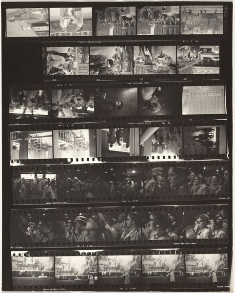 Curator: This gelatin-silver print by Robert Frank, titled "Cowboys no number," captures scenes from 1954. It presents a contact sheet showcasing multiple frames of a rodeo or similar event. The image presents as an indexical mapping of his encounter. Editor: It’s incredibly raw, isn't it? The grit of the rodeo comes right through. There's a visible materiality of light and silver in the contrasted moments, almost like the light is corroding time itself as we encounter it in the frame. Curator: I'm drawn to how the repetition and arrangement contribute to the work's formal properties. The grid-like structure contrasts nicely with the organic, unpredictable actions captured within each frame. Semiotically, each panel constructs a narrative, yet fragmented and open to interpretation. Editor: Agreed, and I find that this is directly related to the process. By showing the contact sheet, Frank emphasizes the selection process and reminds us that photography, no matter how "decisive" the moment, relies on this editorial construction. What he shows us is work. You can imagine the photographer immersed in the physical work, editing, ordering, touching, assembling—the trace of that manual labor. Curator: And the tonality! The shades of gray accentuate texture, heightening contrast to delineate shapes clearly while drawing you into specific points of visual tension. The composition in the selected frames further emphasize this pull and push, giving the sense of the event with a cinematic quality, akin to freeze-frames, capturing pivotal scenes. Editor: Consider also the limitations Frank faced with his equipment. He didn't have sophisticated post-production capabilities we have today; it was physical. Dodging, burning, chemicals all contributed to the making, highlighting what Roland Barthes calls photography’s inherent 'certificate of presence.' Curator: True, the limitations can inform how we view and assess art. Frank's choices enhance our reading of light and texture, as though the medium underscores what might escape unnoticed by a less meticulous eye. Editor: Precisely, the print stands as both documentation and physical artifact. It underscores how the manufacturing process, as a historical construct, is integral to what this picture can ‘mean.’ Curator: Indeed, it's an instance where Frank transforms a simple scene into an inquiry of visual language, the structure revealing its poetic power. Editor: Leaving us to consider how Frank made art visible in a time that was increasingly obsessed with photographic imagery, rather than what goes into image-making.