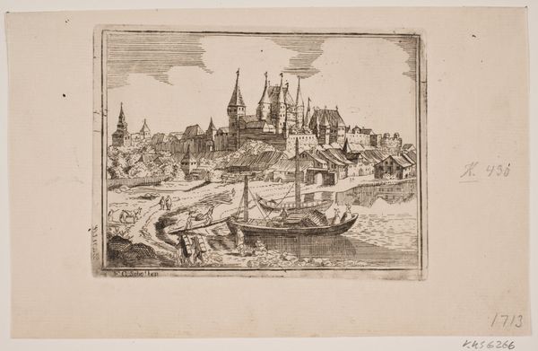 Curator: Here we have Jean Théodore Joseph Linnig's "Gezicht op de werf in Antwerpen vanaf de Schelde," an etching from 1868. The "View of the Antwerp shipyard from the Scheldt," to put it in simpler terms for my fellow monoglots. Editor: Wow, that title’s a mouthful! My first thought? Tranquility. Despite being a shipyard, it feels so… peaceful. All those spires and clouds mirrored in the water, a softer touch for such an industrial place. Curator: It is a remarkably serene take. Linnig’s choice to depict a shipyard this way perhaps underscores the importance of Antwerp as a booming center of trade and industry during the mid-19th century. Look at the scale of everything, the way he balances all these architectural elements! The Church is right up there, the ships. You can’t miss that activity of the Scheldt river at the foreground either, can you? Editor: No, definitely. It almost romanticizes industry, which is quite an angle. Do you think Linnig chose etching for its detail or something else? All those intricate lines… Curator: Well, printmaking, especially etching, became increasingly important in distributing images, creating a visual record of the period. This technique allowed Linnig to reach a wider audience. And think about the composition; it echoes older baroque cityscapes with a fresh twist of modernization. It seems as much about pride as pure documentation. Editor: Hmm. Pride, definitely. I think of how the people working in those shipyards might feel seeing themselves represented so… grandly. It is as though they, along with all other actors of this cityscape, were the main pillars of the painting. Did many artists capture city views like this? Curator: Oh, absolutely. Cityscapes like this offered powerful statements about urban identity and growth, serving as documents but also projecting civic ambitions. Artists like Linnig were part of shaping how Antwerp saw itself. They turned industry into an art of urban life. Editor: You know, I see that a lot clearer now. What initially struck me as quiet beauty, and technical craftsmanship, has far deeper cultural significance. It goes to show what layers of meaning can be packed in one serene, beautiful print. Curator: Precisely. I would say it allows us a moment of introspection when examining how our surroundings form and reform us. An art that keeps looking forward and looking back is timeless art indeed.