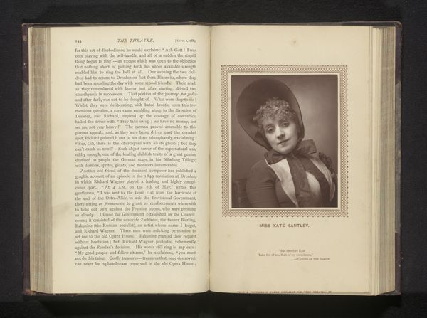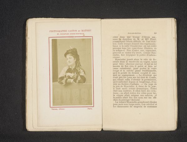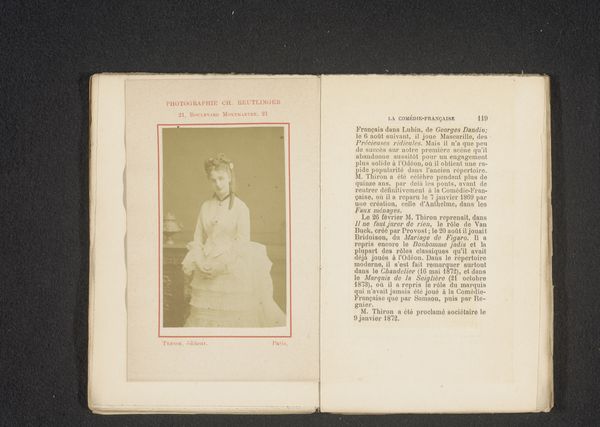 This is Nadar's portrait of Angèle, captured using photography sometime in the mid-19th century. The sepia tones give the image a warm, nostalgic feel, focusing our attention on the subject’s attire and features. The composition emphasizes Angèle’s face and upper body, framed within a rectangular border that mimics a stage. The use of light and shadow sculpts her features, highlighting her expression. The gaze is directed slightly upwards, adding an element of aspiration or perhaps theatrical drama. Considering the semiotic elements, the floral hairpiece and ornate dress may signify ideals of beauty and performance during the period. Nadar's choice to focus on Angèle’s individual persona, rather than idealizing her, challenges the traditional portraiture conventions. The photograph, therefore, serves as both a record and a representation of shifting cultural values. Ultimately, the portrait encourages us to question how photography destabilizes established notions of identity.