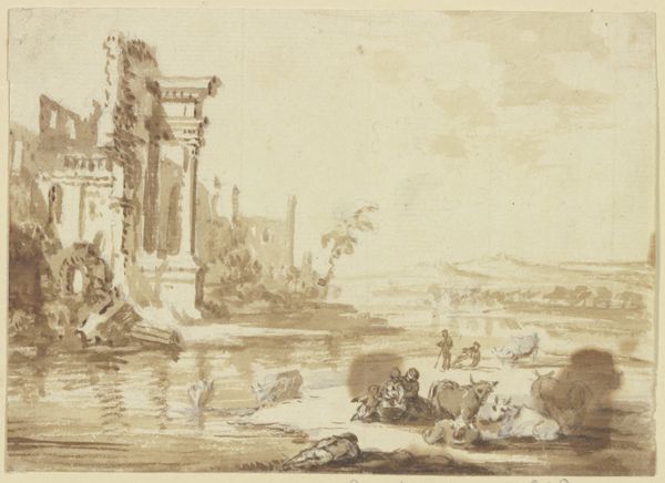 Editor: This etching, "A Fortified Village along a River" by Marco Ricci, created around 1727-1729, presents a fascinating scene. There’s almost a feeling of everyday life coexisting with these monumental, perhaps decaying, structures. What stands out to you in this piece? Curator: It's crucial to consider the genre-scene through a lens that acknowledges its construction, not just its representation. How do we interpret Ricci's romanticized view of labor within the broader context of Venetian society at that time? The figures by the river aren’t just incidental; they are placed there intentionally, contributing to a narrative of rustic simplicity. But is this simplicity authentic, or is it a performance for a specific audience? Editor: That's a perspective I hadn’t considered. So, the focus isn’t just on the aesthetic appeal of the landscape, but also on the social implications embedded within the depiction of daily life? Curator: Precisely. The etching style itself contributes to this narrative. The delicate lines and tonal variations soften the harsh realities of labour and potentially mask the systemic inequalities inherent in Venetian society. Think about who this art was made for, who had access to it, and what power dynamics were at play. Who benefits from romanticizing labor like this? Editor: So it’s about looking beyond the surface and considering whose story is being told, and who is being excluded? Curator: Absolutely. It urges us to think critically about whose perspectives are valued and whose are erased in the artistic record. Even in seemingly innocent scenes like this. Editor: I’ll definitely carry that with me when analyzing art in the future. It adds so much depth. Curator: Indeed, looking at art through such an intersectional lens transforms our experience of viewing.