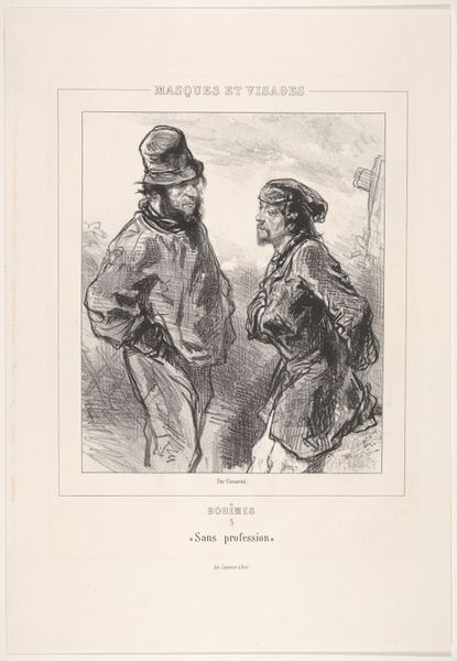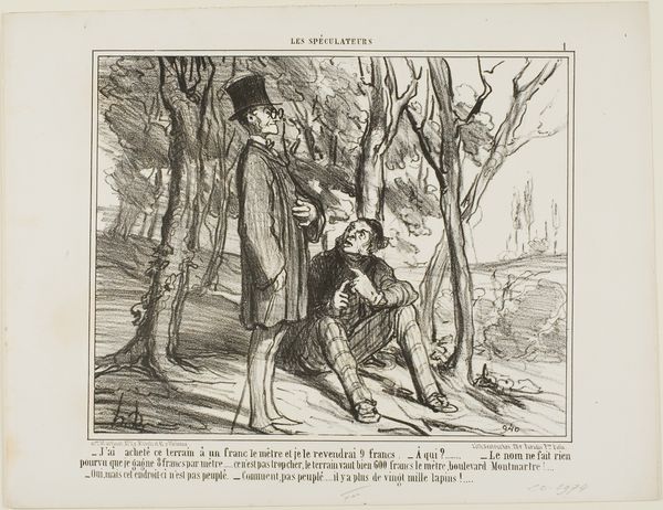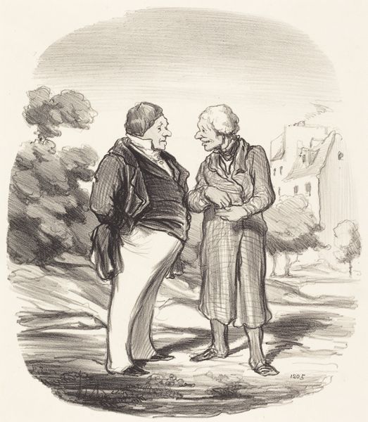 Honoré Daumier created this lithograph, plate 39 from Tout Ce Qu'on Voudra, with ink on paper. Here, Daumier presents us with two Parisian gentlemen in a winter scene. Produced in 19th-century France, the print utilizes the visual language of caricature to critique social norms. Daumier was deeply engaged in the political life of his time, often using his art to comment on the bourgeoisie and the political climate. The "Tout Ce Qu'on Voudra" series, which translates to "Whatever You Like," suggests a satirical take on contemporary society. The men's attire, their stiff posture, and the surrounding bare trees all contribute to the overall sense of discomfort and social critique. The statue in the background is a nod to art institutions and the culture that supports the wealthy. To fully understand Daumier’s work, research into French social history, political satire, and the development of print media is essential. The meaning of the art here is contingent on its social and institutional context.