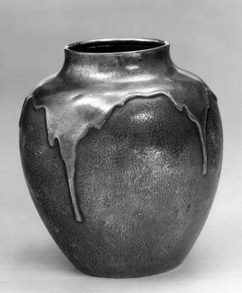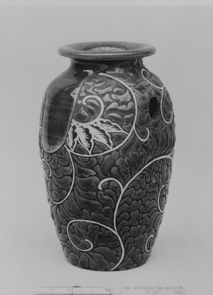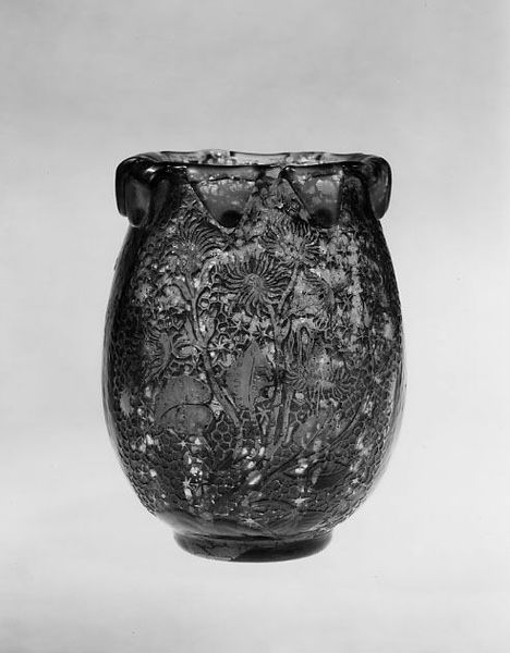 Curator: Let’s consider this glass vase, created around 1900 by Émile Gallé. The work is currently held here at The Metropolitan Museum of Art. Editor: Ooh, it’s a bit moody, isn't it? Sort of gothic romance meets decorative art. That subdued tone makes you want to hold it and whisper secrets. Curator: Indeed. The vase exhibits characteristics of Art Nouveau, noticeable in the integration of natural forms, here expressed via a pronounced, sculpted floral motif. Notice how the artist employs glass not only as a medium but also as a sculptural element. Editor: It almost feels alive, like it's breathing somehow. And the flower isn’t just decoration; it tells a story of transformation. Each petal a verse, perhaps? There is an elegant but subdued eroticism here, almost dangerous... Curator: One could certainly read a symbolic dimension into the piece. Gallé, along with many Art Nouveau artists, drew heavily from Symbolism. In scrutinizing the materiality and the form, we understand how meaning is produced not merely through representation but through the interplay of material and symbolic referents. Editor: I love that. For me, its monochrome effect lends a gravity to it. Like a shadow or dream preserved. Makes you wonder what other spectral flowers bloomed from his hands. Curator: It's precisely the intersection between decorative function and aesthetic contemplation that is rewarding to consider. Editor: Right. It's as though Gallé conjured this from moonbeams. Looking at its sinuous lines and sculpted darkness I want to believe that fairytales are real and flowers have souls. What a trip. Curator: Very good. Considering this piece through its structural qualities and symbolic investments provides insight into its cultural value and continued artistic legacy. Editor: True. So next time I am serving wine, I’ll probably reach for it! Maybe only on particularly gloomy days though.