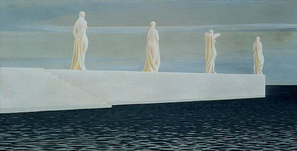 Editor: This is John Duncan’s painting, “The Turn of the Tide”. It’s an oil painting. It has a very tranquil feel to it, but also feels melancholic. How do you interpret this work? Curator: I think you've hit on some key aspects. Given the historical context of symbolism, particularly its Scottish variant, and its presentation as an idealized figure amidst a landscape, it begs the question of what ‘tide’ is turning? Is it personal, societal, political? Is the figure meant to represent hope or despair? Editor: That's interesting. The ‘tide’ as a political symbol – I hadn't thought of that. Curator: The late 19th and early 20th centuries saw the rise of nationalism, particularly Scottish nationalism. So, is this a statement on Scotland’s position? Symbolism often provided a veiled way to comment on sociopolitical issues. Duncan was exhibiting within a community of artists in Edinburgh invested in Scottish culture. Knowing that shapes our understanding, doesn't it? Editor: It certainly does! And her dress, it’s not really contemporary with that time, is it? Curator: No, not at all. Think about why artists reach to other moments to explore their cultural beliefs. What is he trying to recapture from another period? It adds another layer of complexity, wouldn't you say? Editor: Yes, it adds another layer of meaning for me to explore. Thanks, that really changed how I see the artwork. Curator: The beauty of art history is it makes us more sensitive viewers.